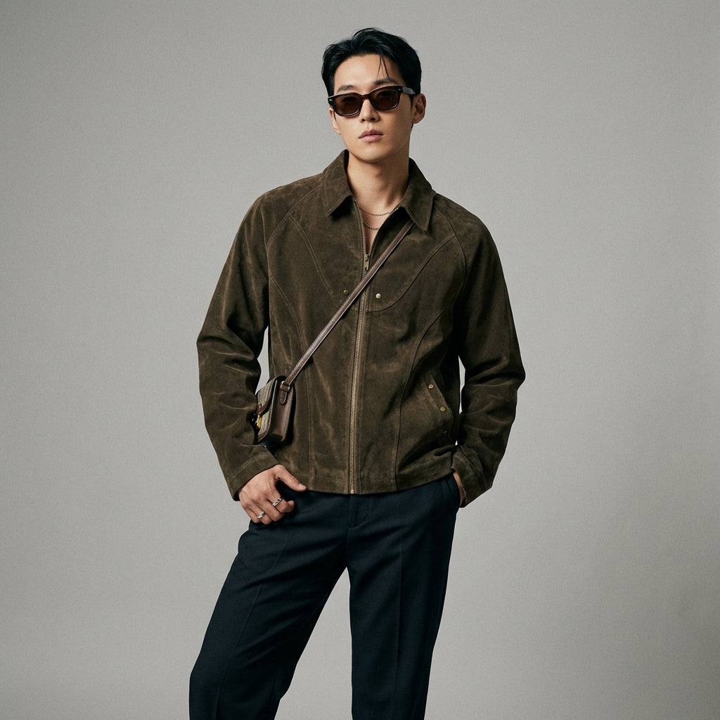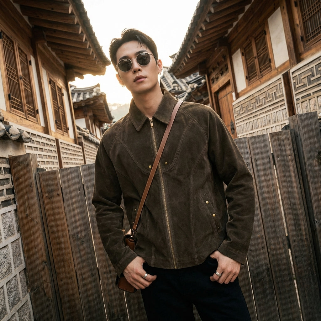 Veste moto suède rétro homme, style streetwear K-fashion, couleur marron ou noire.