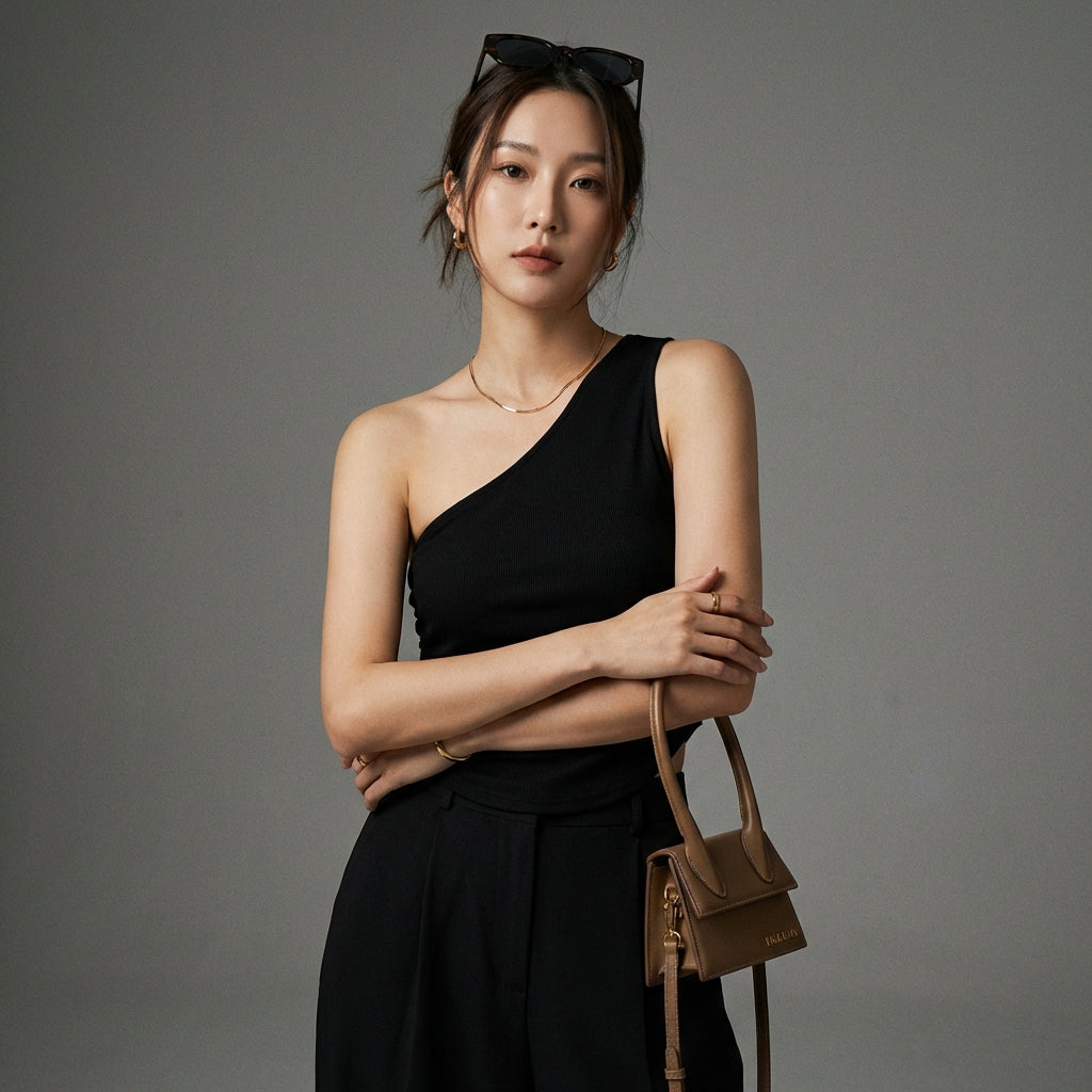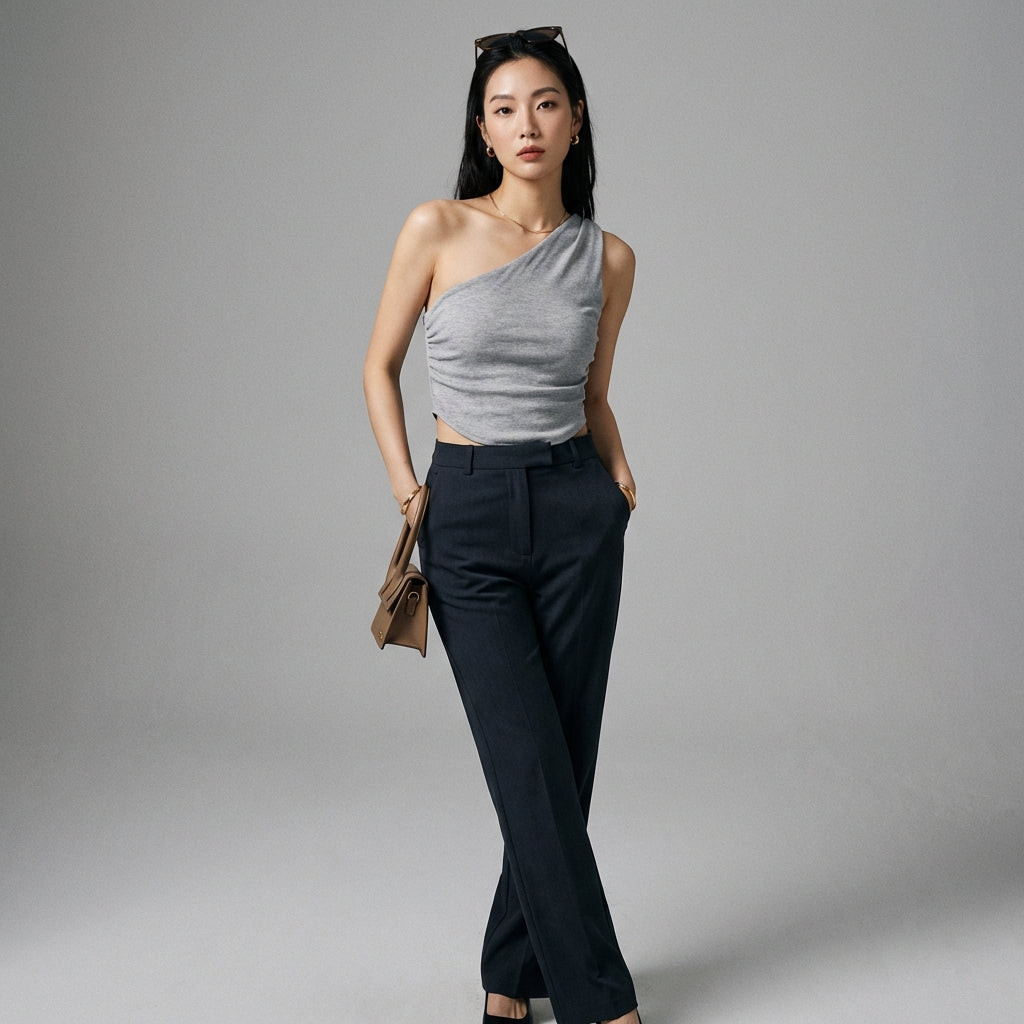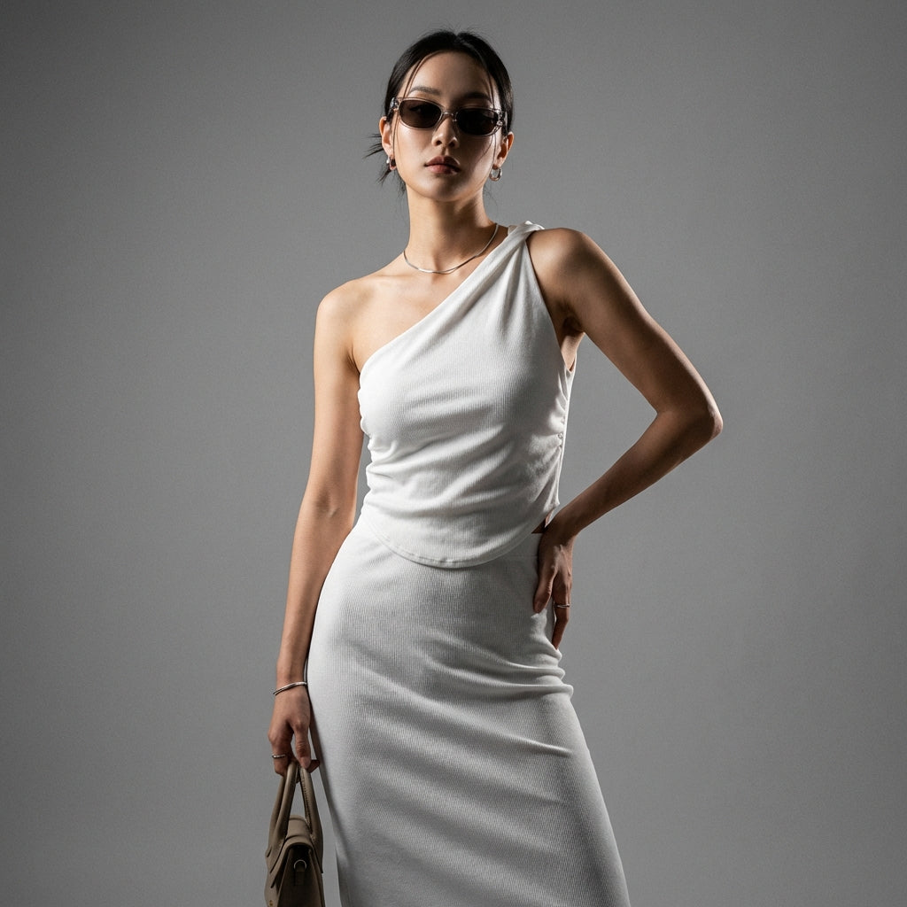 • Type: Asymmetrical tank top, Slim fit. A cut designed to enhance the silhouette while ensuring optimal comfort.