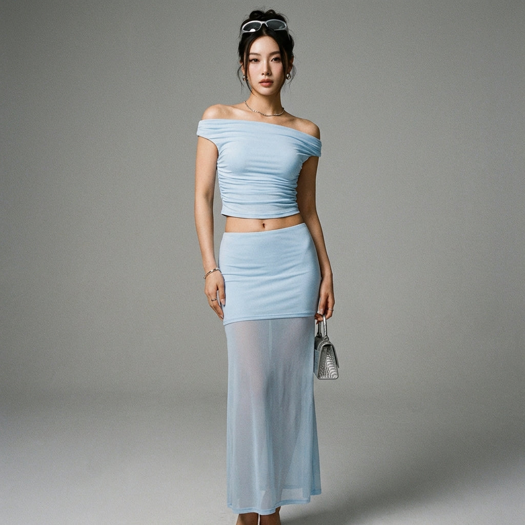 - Type: Two-piece set, Asymmetrical top, Fitted long skirt. A modern cut that enhances the silhouette with sophistication.