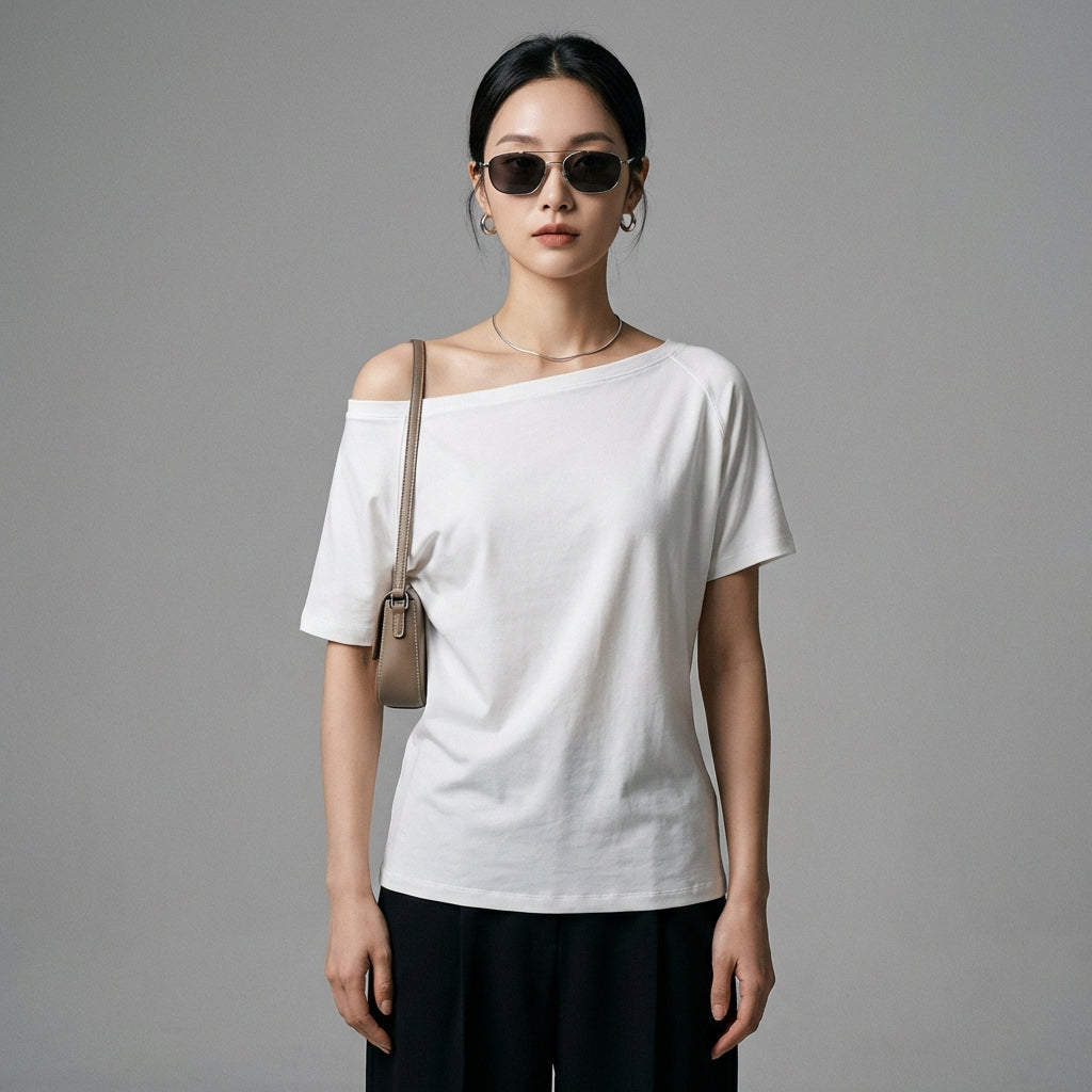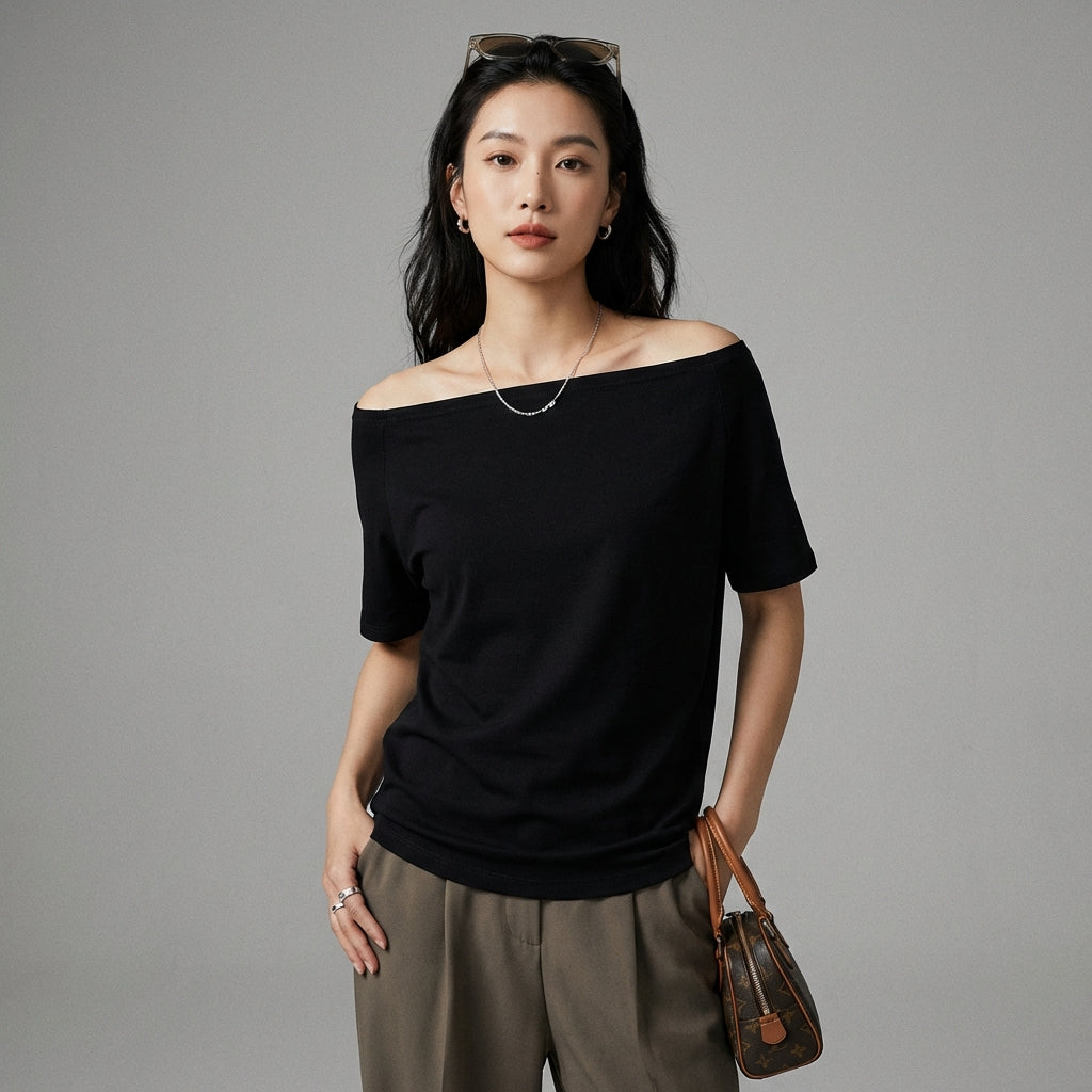 Embrace a trendy and casual look with our basic off-the-shoulder T-shirt. Its slim fit and oblique collar offer a modern and elegant silhouette, perfect for all occasions. A revisited essential for a confident style! ✨