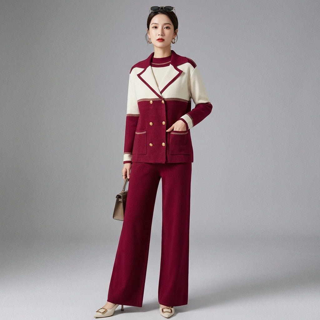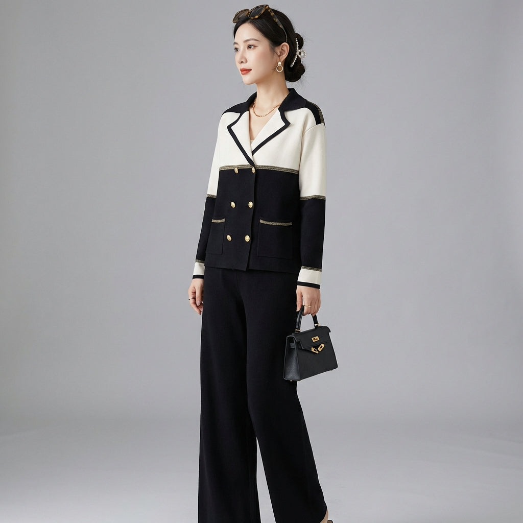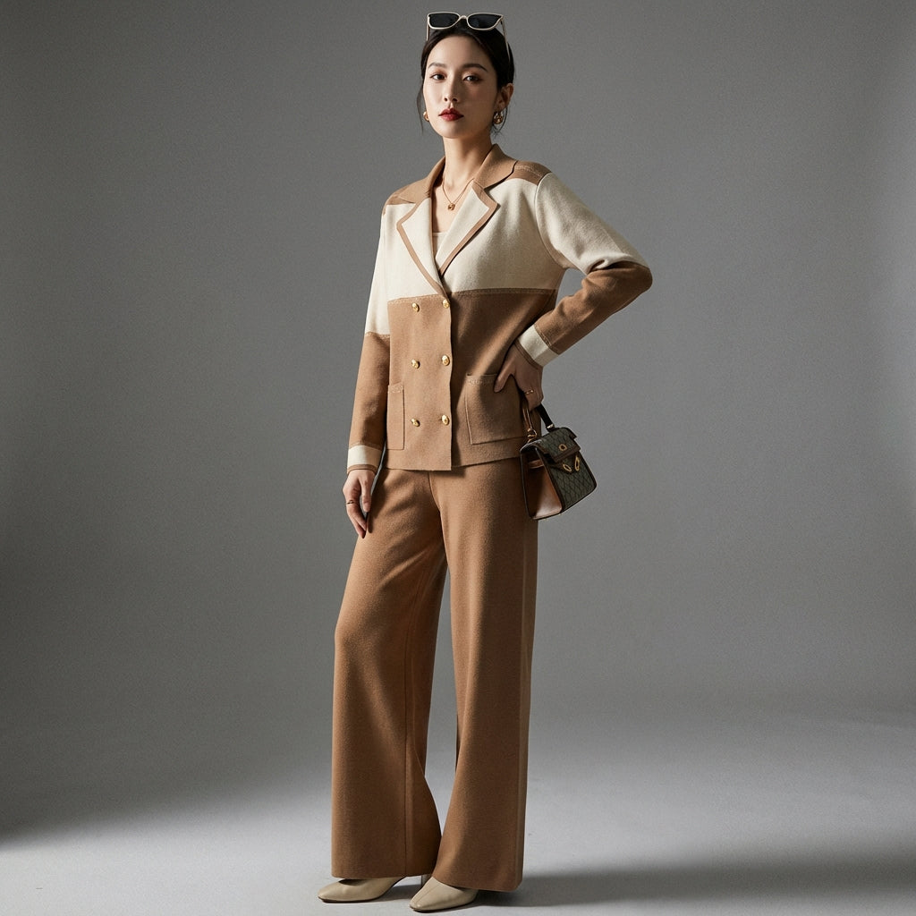 - Type: Two-piece set, Double-breasted blazer, Wide-leg trousers. A loose and comfortable fit for a modern silhouette.