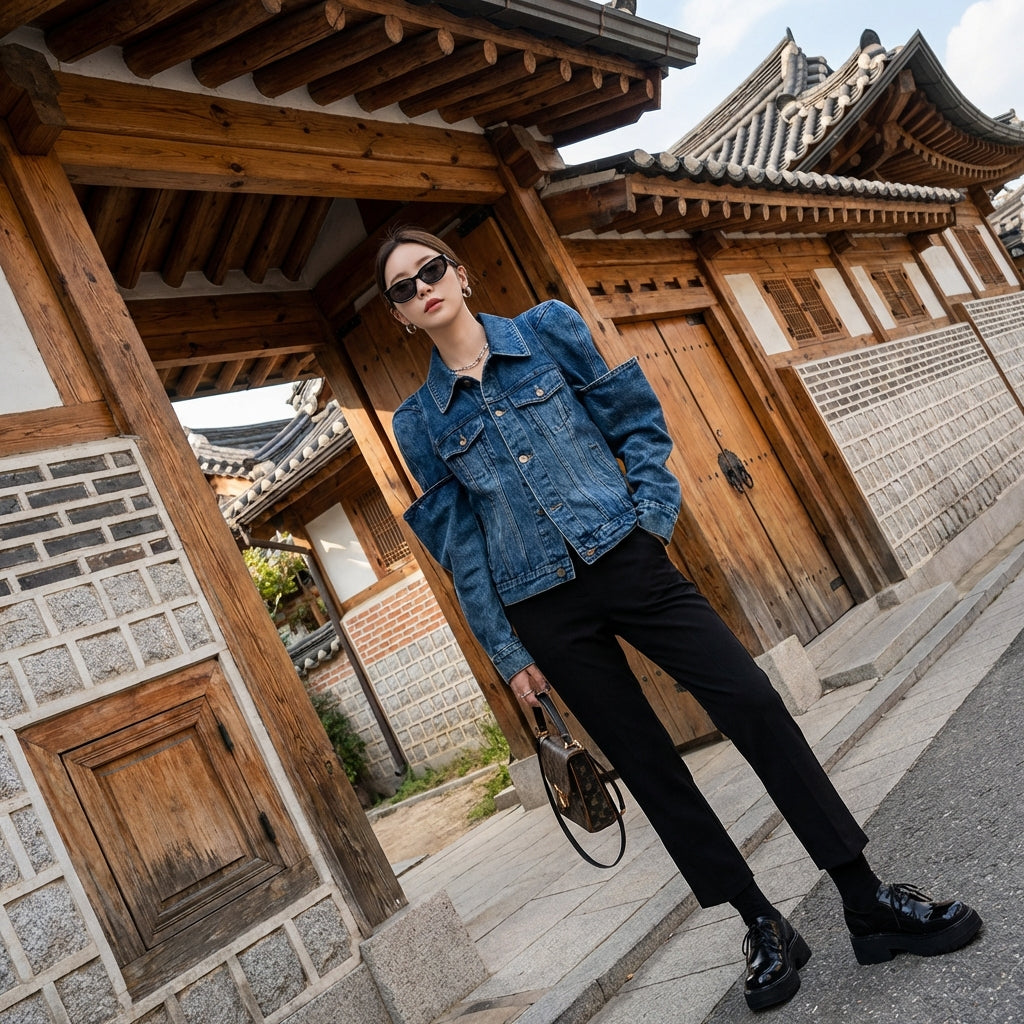 Femme portant une veste en jean oversize bleue, mode streetwear coréenne