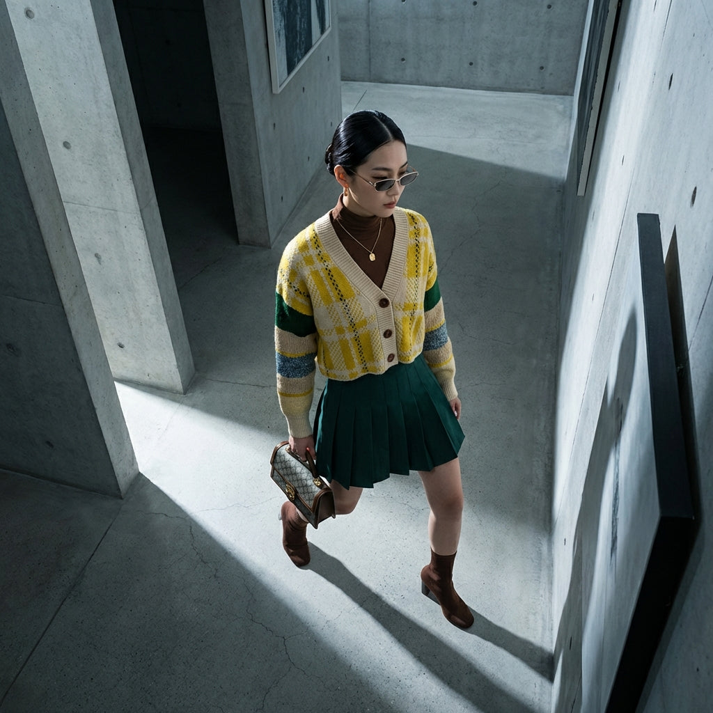 Cardigan tricoté à carreaux col V, manches tombantes, style K-fashion moderne.