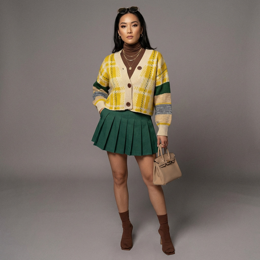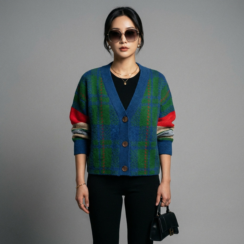 Embrace a casual yet chic look with our knitted plaid cardigan. This versatile piece features a V-neck and drop shoulders for an oversized, modern style. Perfect for layering and adding a touch of sophistication to your everyday outfits! ✨