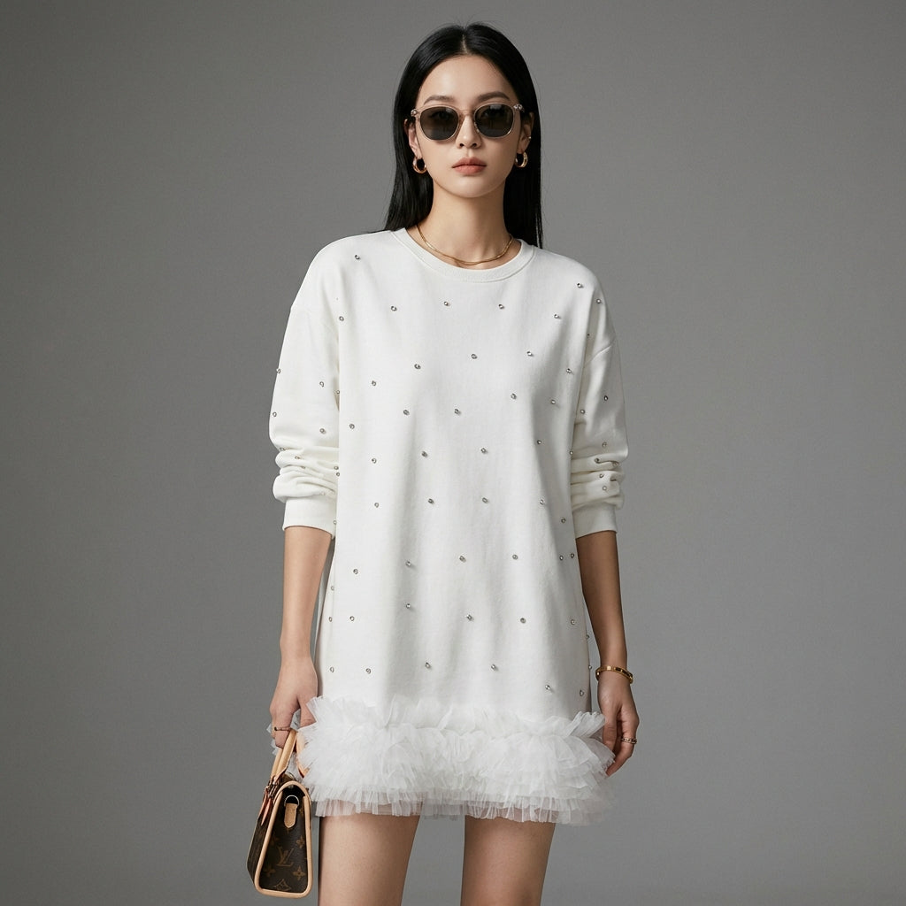 Embrace a trendy and casual look with our long-sleeved, crew-neck sweatshirt. Its unique design incorporates diamond mesh inserts for a touch of originality and sophistication. Perfect for a modern and comfortable everyday style! ✨