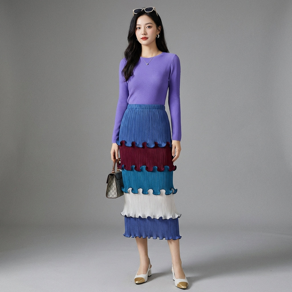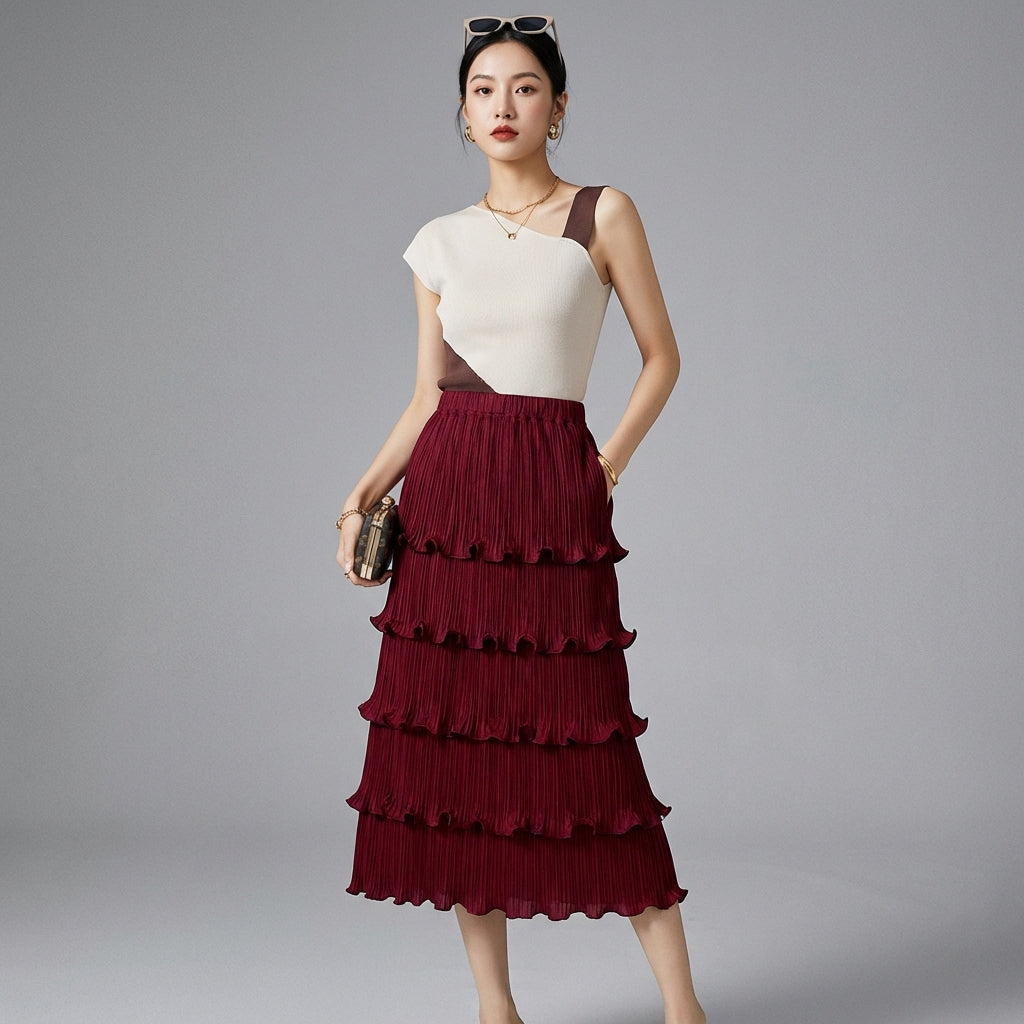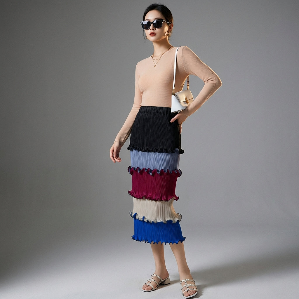 Discover our high-waisted pleated skirt, a centerpiece for an elegant and refined look. Its midi length and sophisticated design enhance the silhouette, while the ruffle details add a touch of femininity. Perfect for the office or a chic outing! ✨