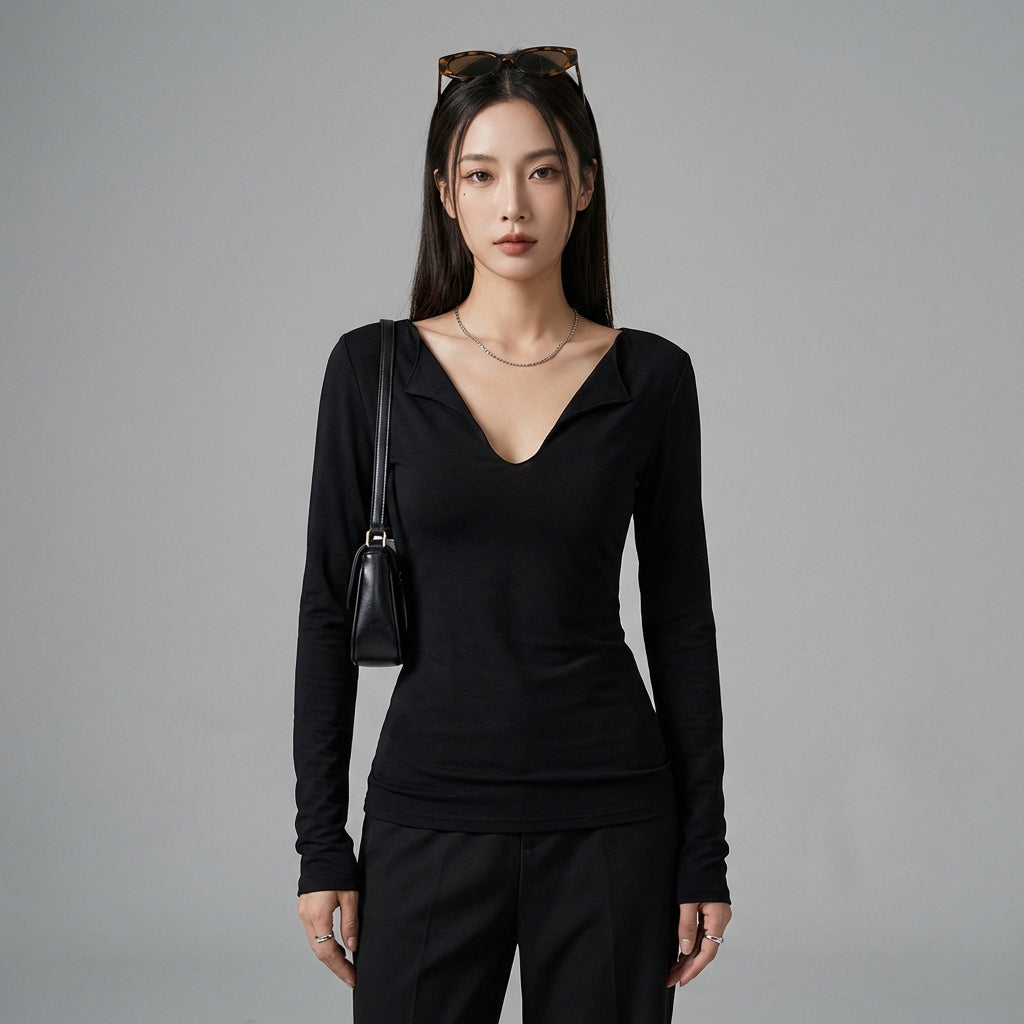 Discover our long-sleeved top, perfect for all occasions. Its deep V-neck and fitted cut enhance the silhouette with a touch of modern elegance. A must-have for a chic and casual look! ✨