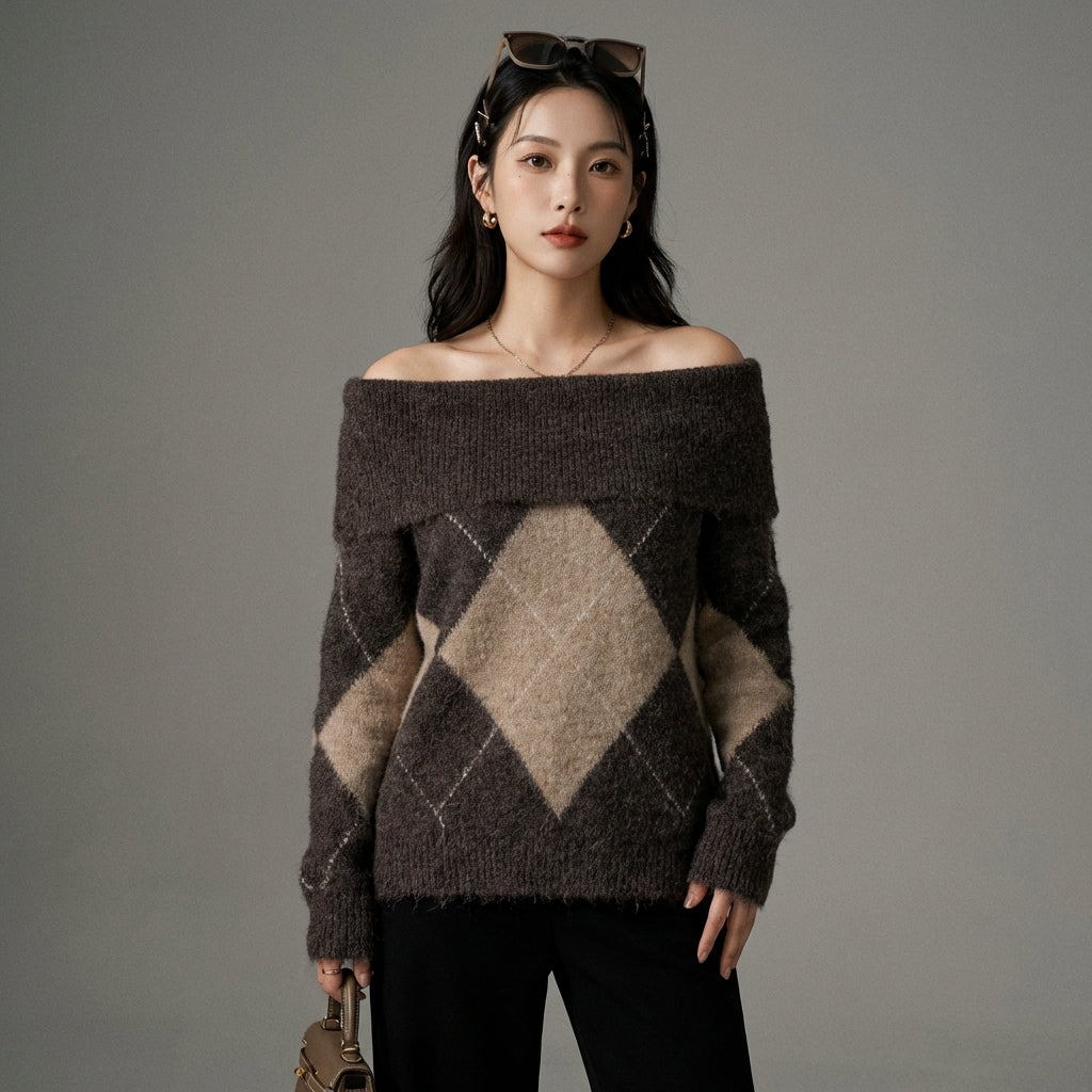Knitted Boat Neck Plaid Sweater