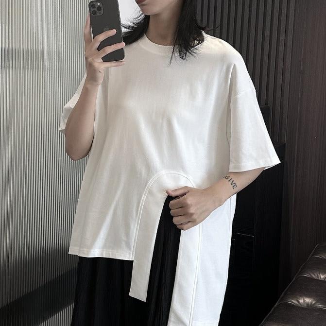 Embrace a casual and trendy look with our short-sleeved cotton T-shirt. Available in black and white, this asymmetrical top is perfect for summer! ☀️