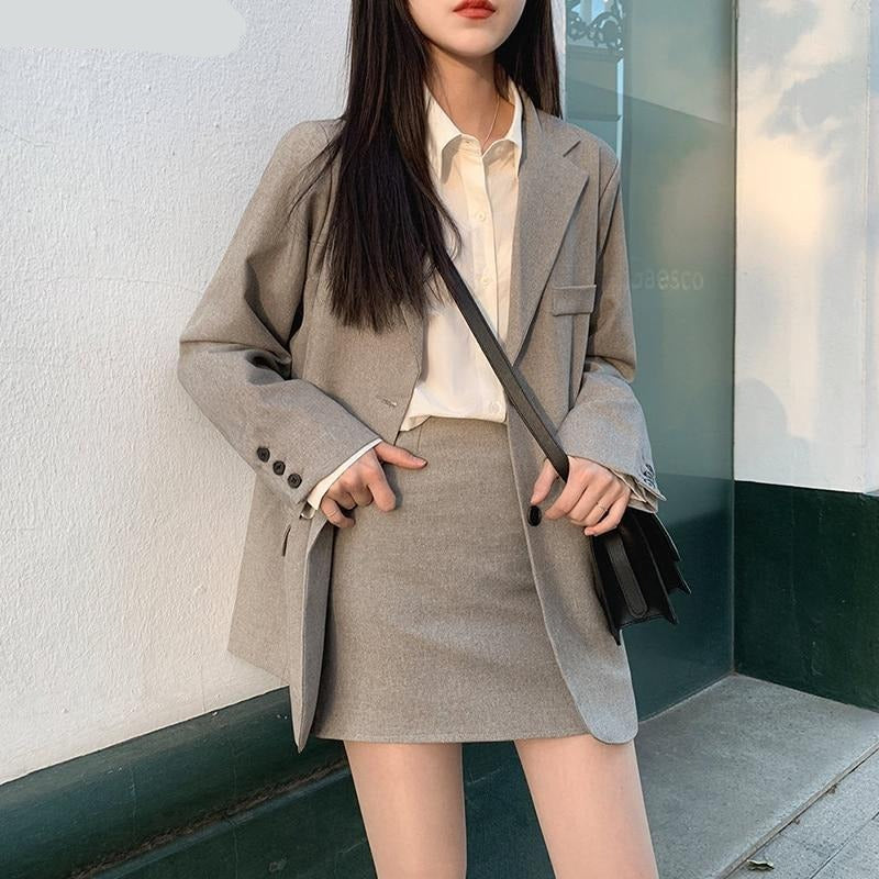 Looking for an outfit to wear to work and stay chic? Here is a Korean suit for women consisting of a dressy skirt and jacket.