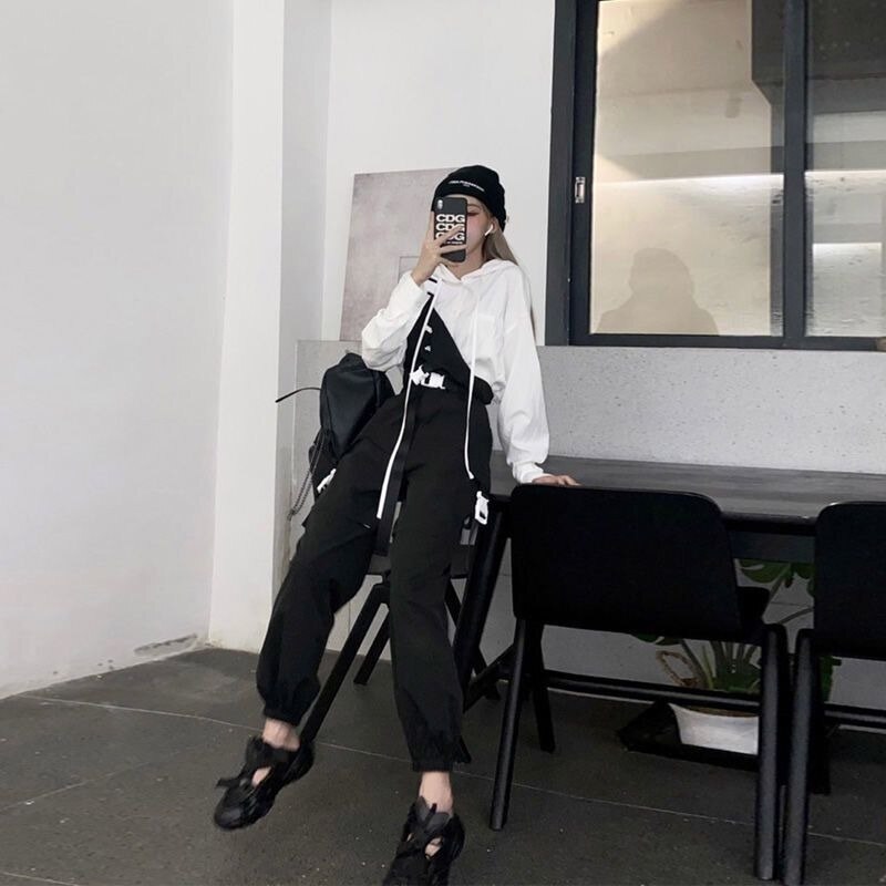 Here is a very popular jumpsuit among young Korean women. It represents Techwear fashion. It is a black outfit with white parts and fastenings. It is very trendy in South Korea.