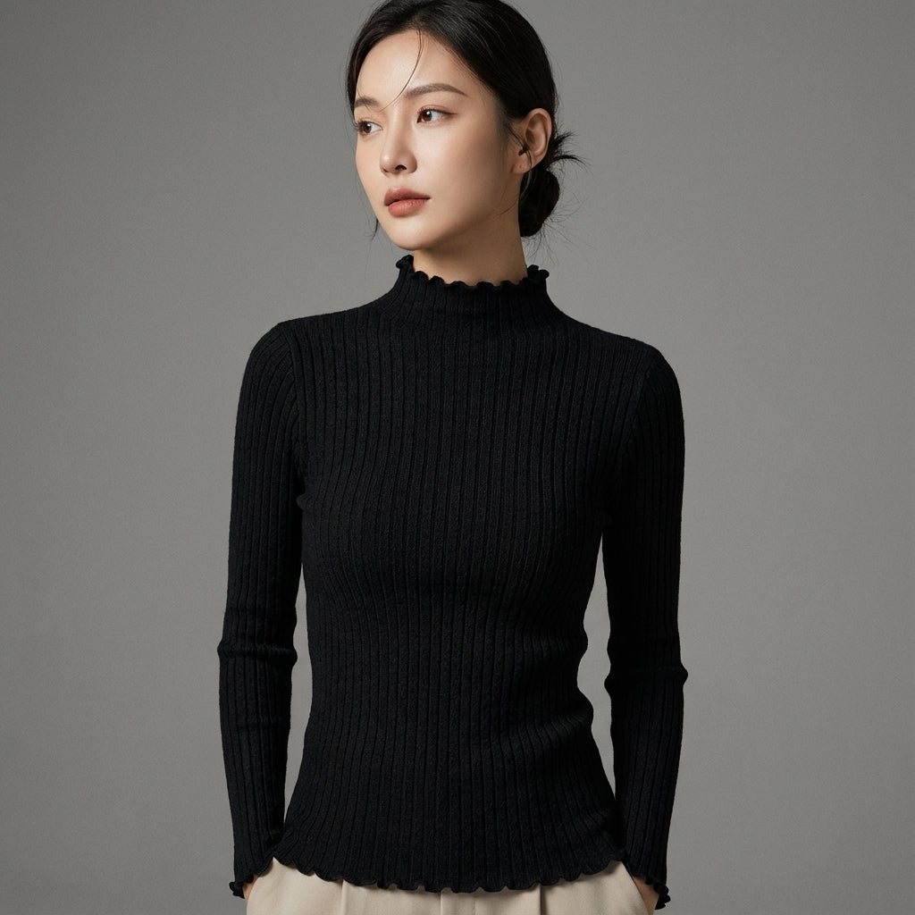 Discover our Korean high-neck sweater, an essential piece for a fresh and trendy look. With its delicate ruffles, it brings a touch of softness and elegance to your wardrobe. Perfect for staying stylish while being comfortable! ✨