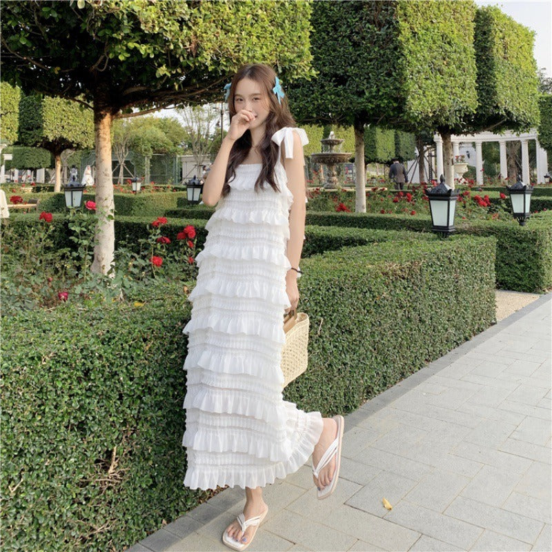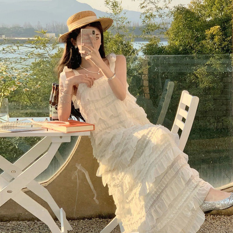 Discover our elegant white slip dress, perfect for summer. Designed with a refined French industry aesthetic, this sleeveless tiered skirt dress is ideal for special occasions and sunny days! ☀️