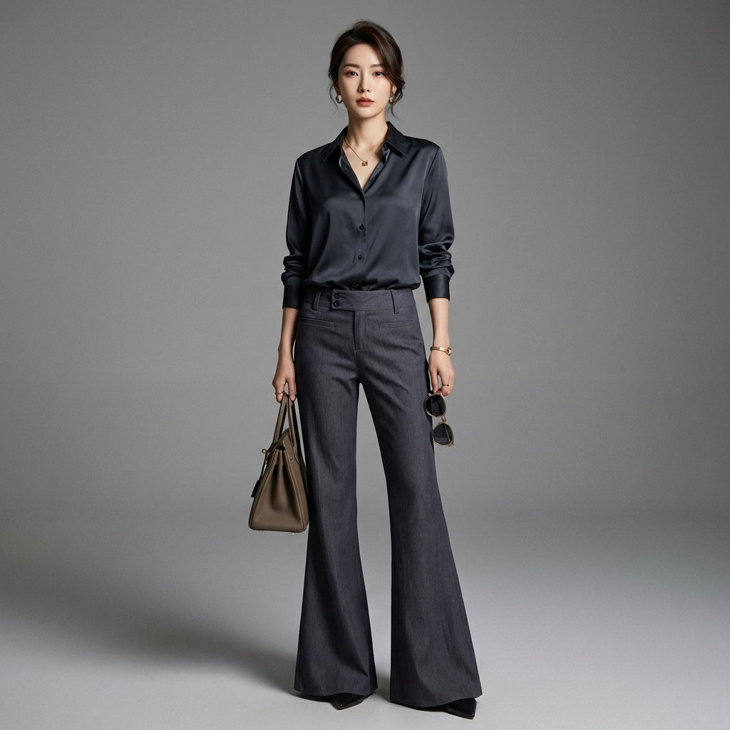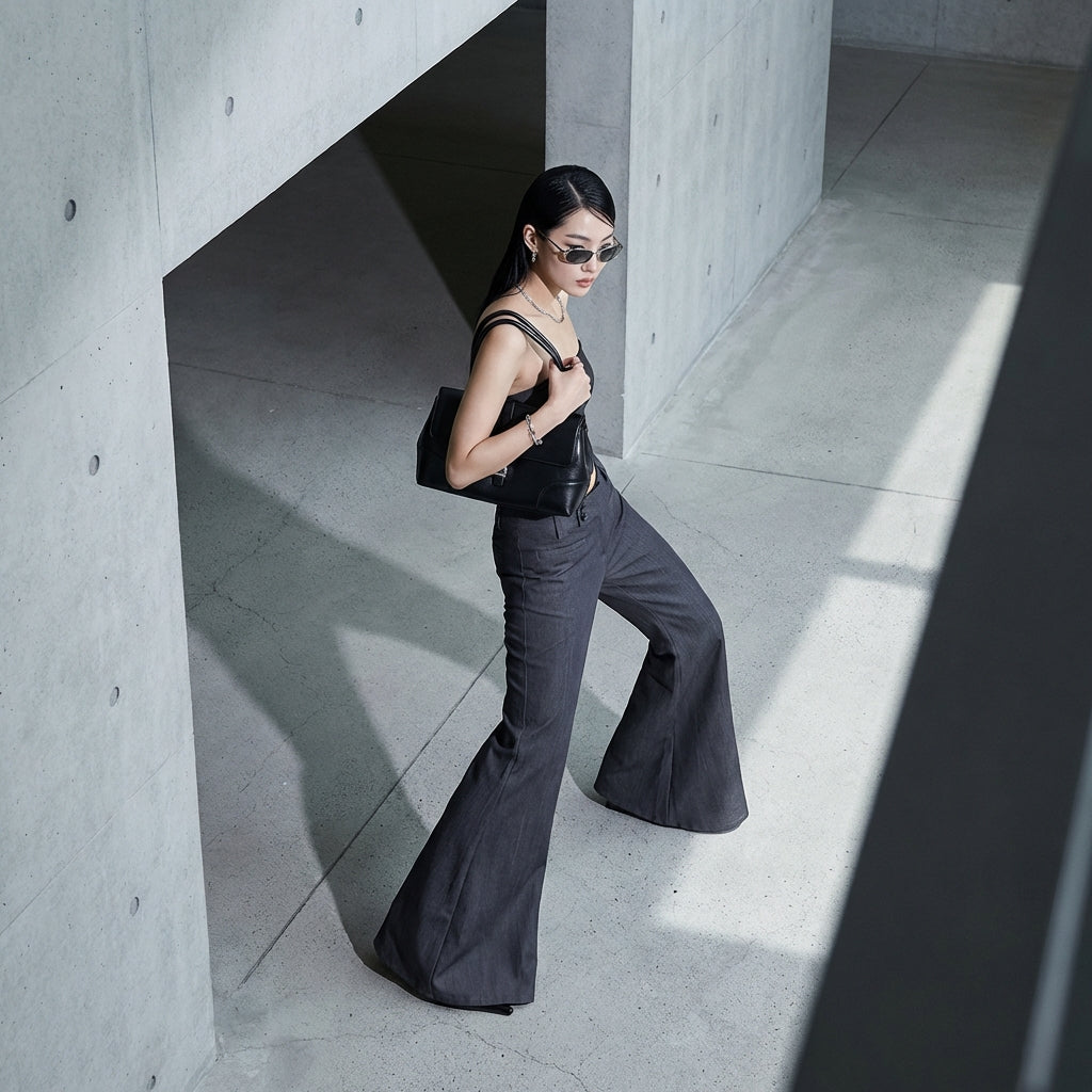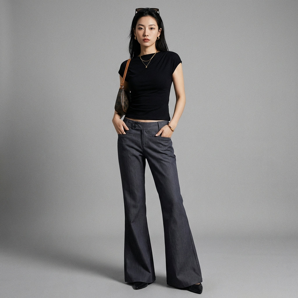 Pantalon évasé taille basse gris femme - Koreanxwear
