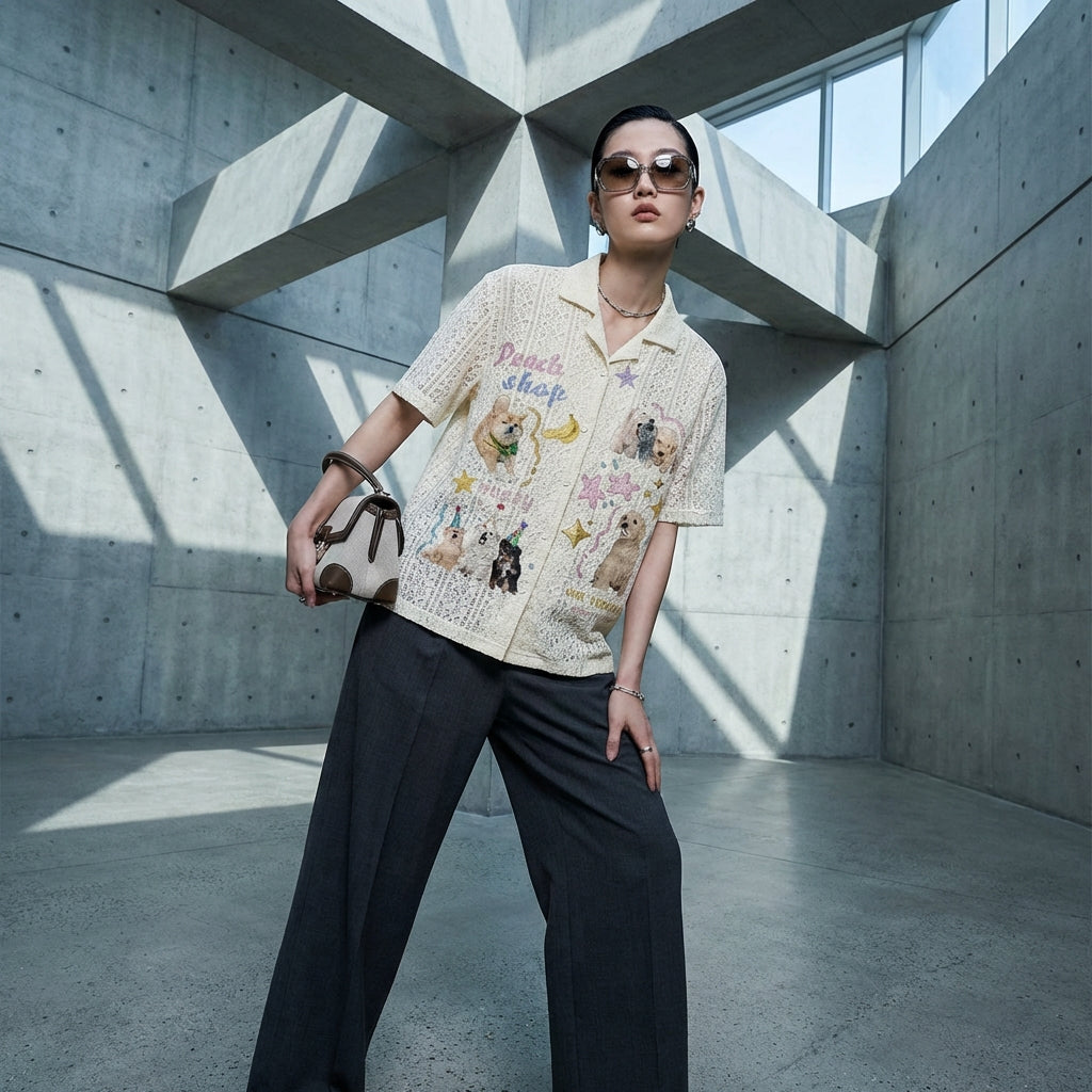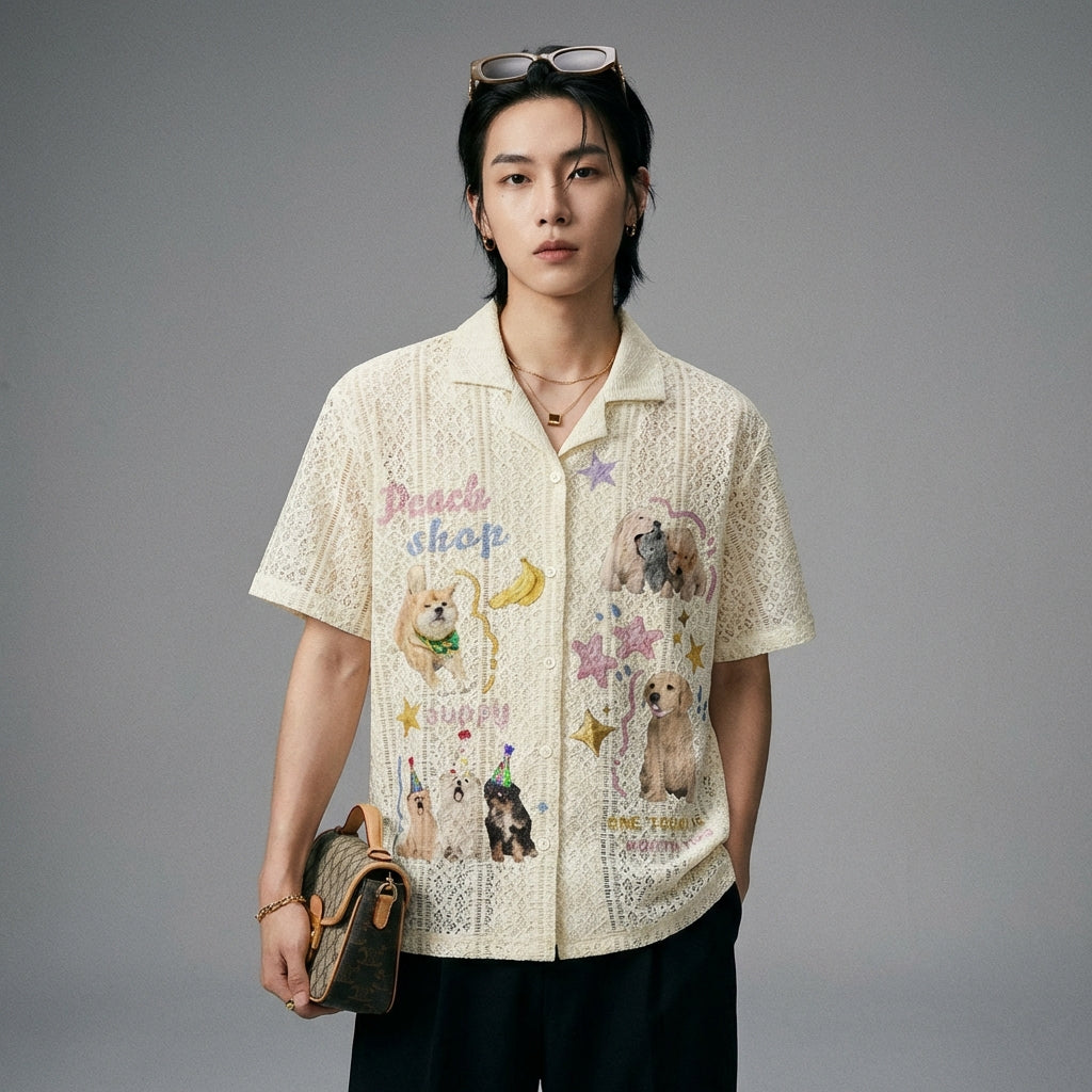 Embrace a casual and adorable look with our oversized short-sleeved shirt, adorned with a charming puppy motif. Its turn-down collar and loose fit make it an ideal piece for a unique and comfortable style! 🐶