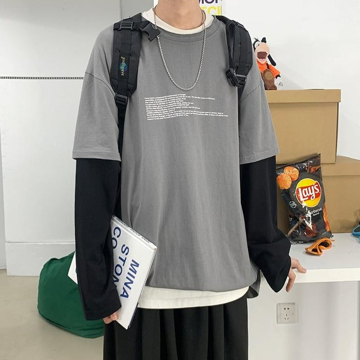 This long-sleeved T-shirt has two distinct parts. It's a friendly top that can be worn in summer or winter. It is very pleasant and features an intriguing text print. It's a trendy T-shirt on the streets of Seoul because it's vintage.