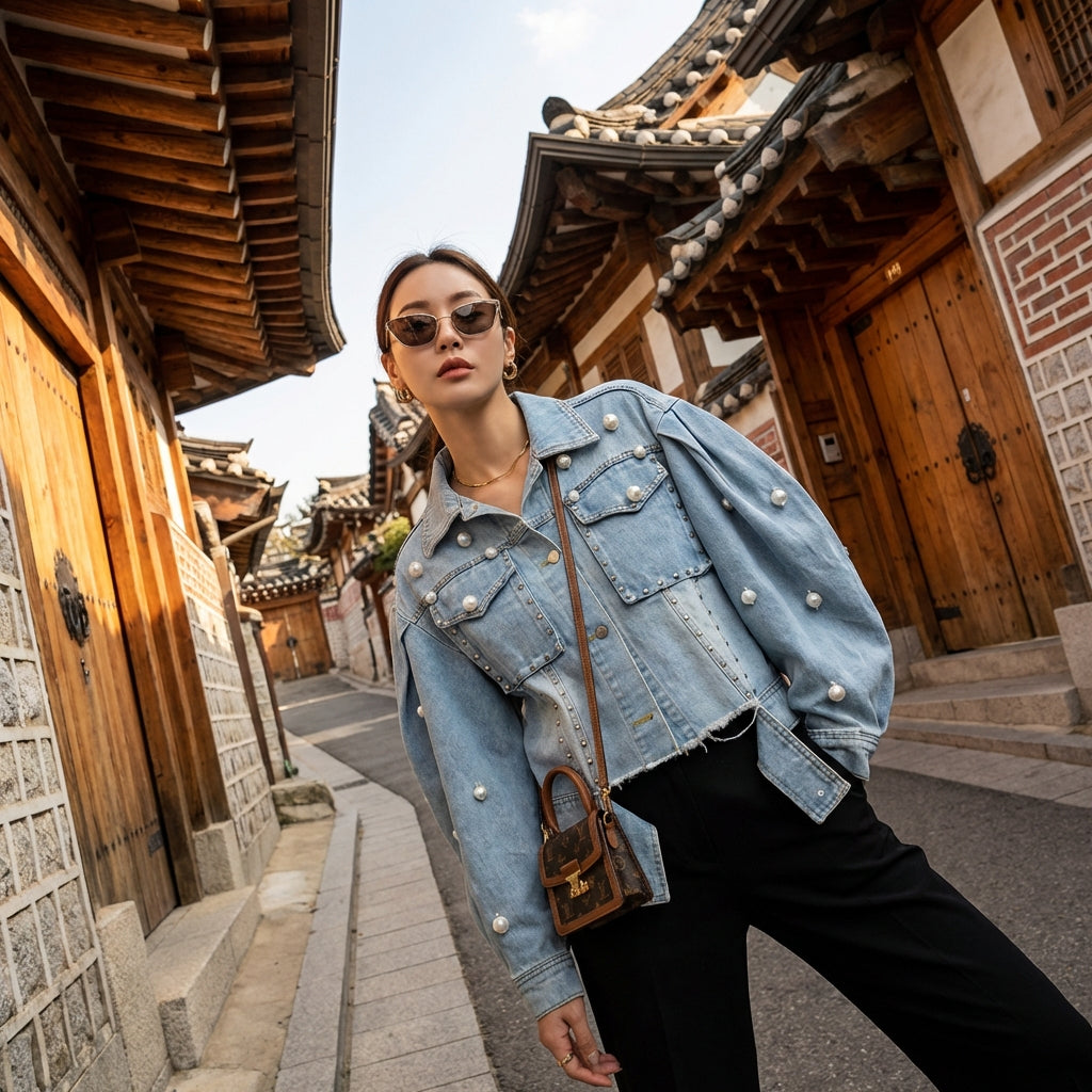 Embrace a trendy and bold look with our pearl-embellished denim jacket. This unique streetwear piece combines the comfort of denim with refined details for a confident style! ✨