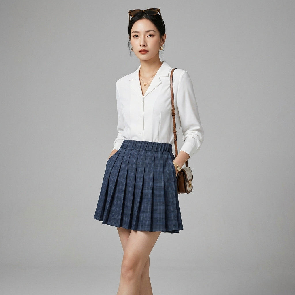 • Type: Mini-skirt, Pleated, High-waisted. A short cut and structured pleats that lengthen the silhouette and add movement.