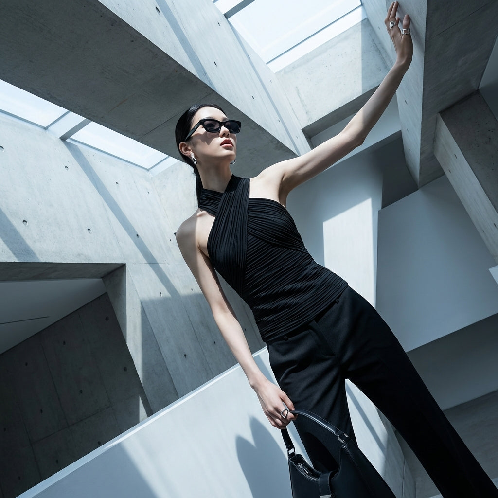 Embrace a trendy look with our black pleated tank top, fitted and sleeveless. Its elegant halter neck and off-the-shoulder design will subtly and stylishly enhance your figure! ✨