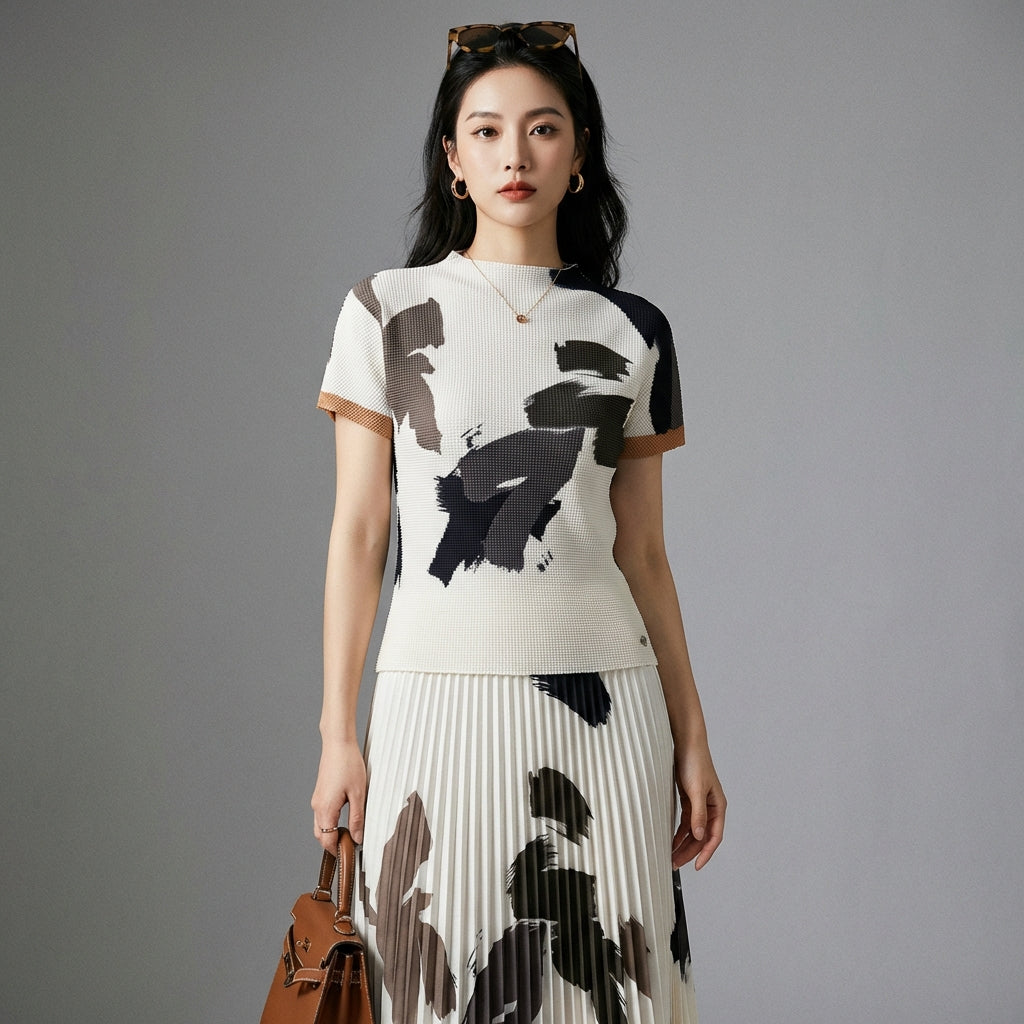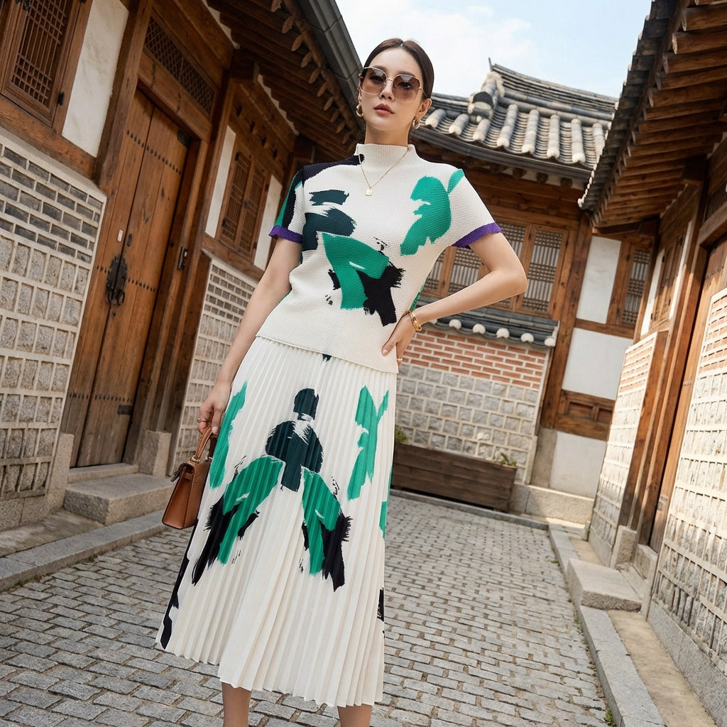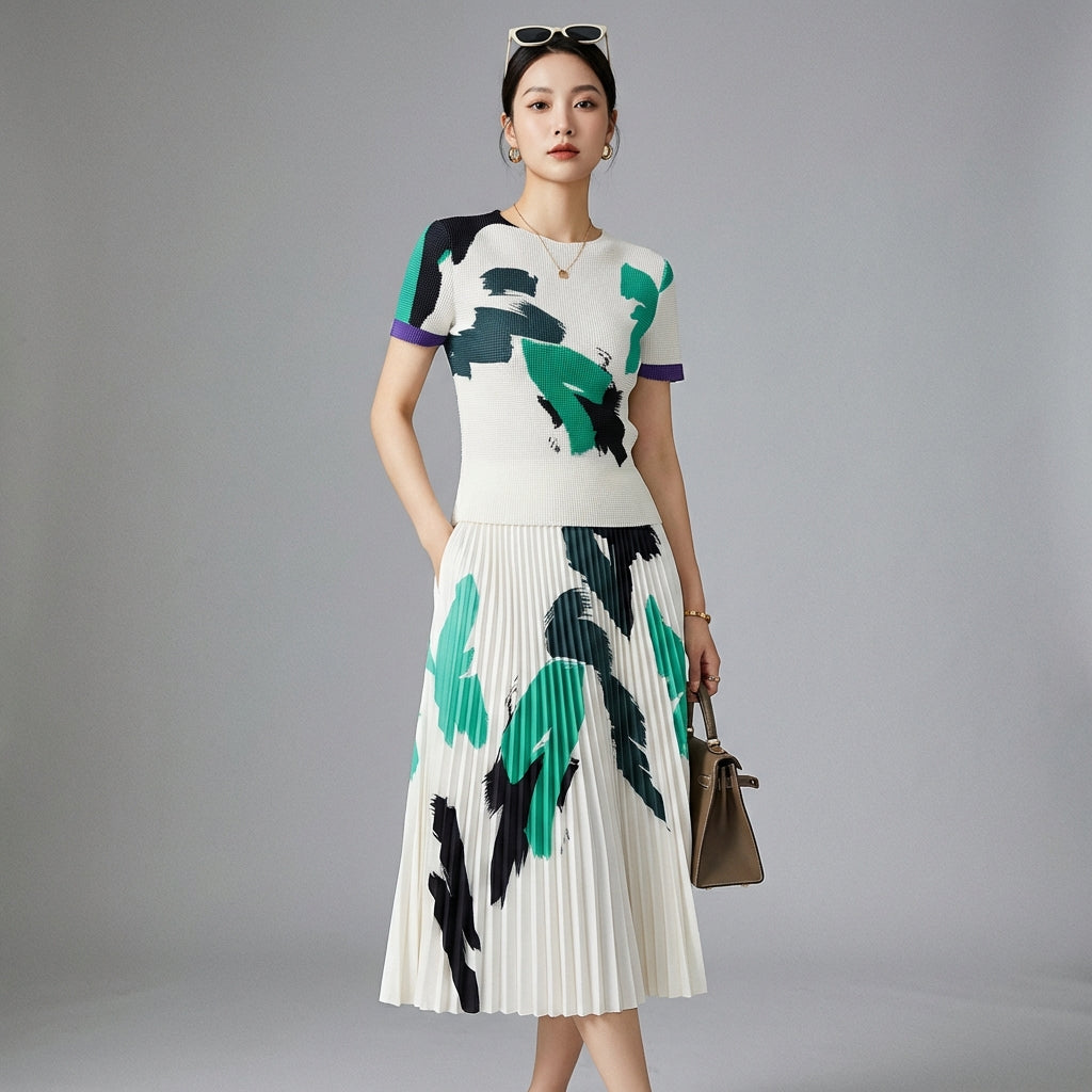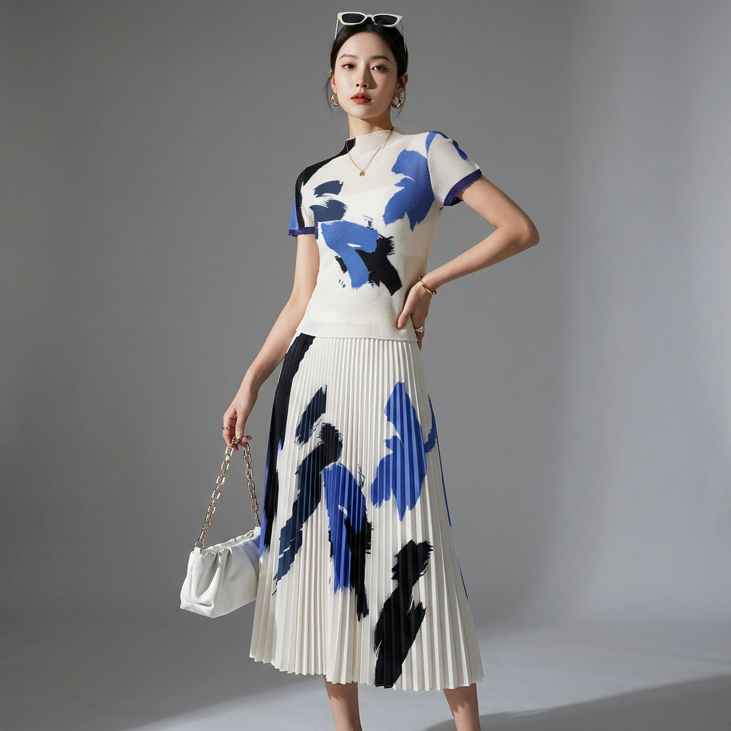 Embrace a modern and refined look with our two-piece set featuring a round-neck, short-sleeved top and a high-waisted, pleated long skirt. Perfect for an elegant yet casual allure! ✨