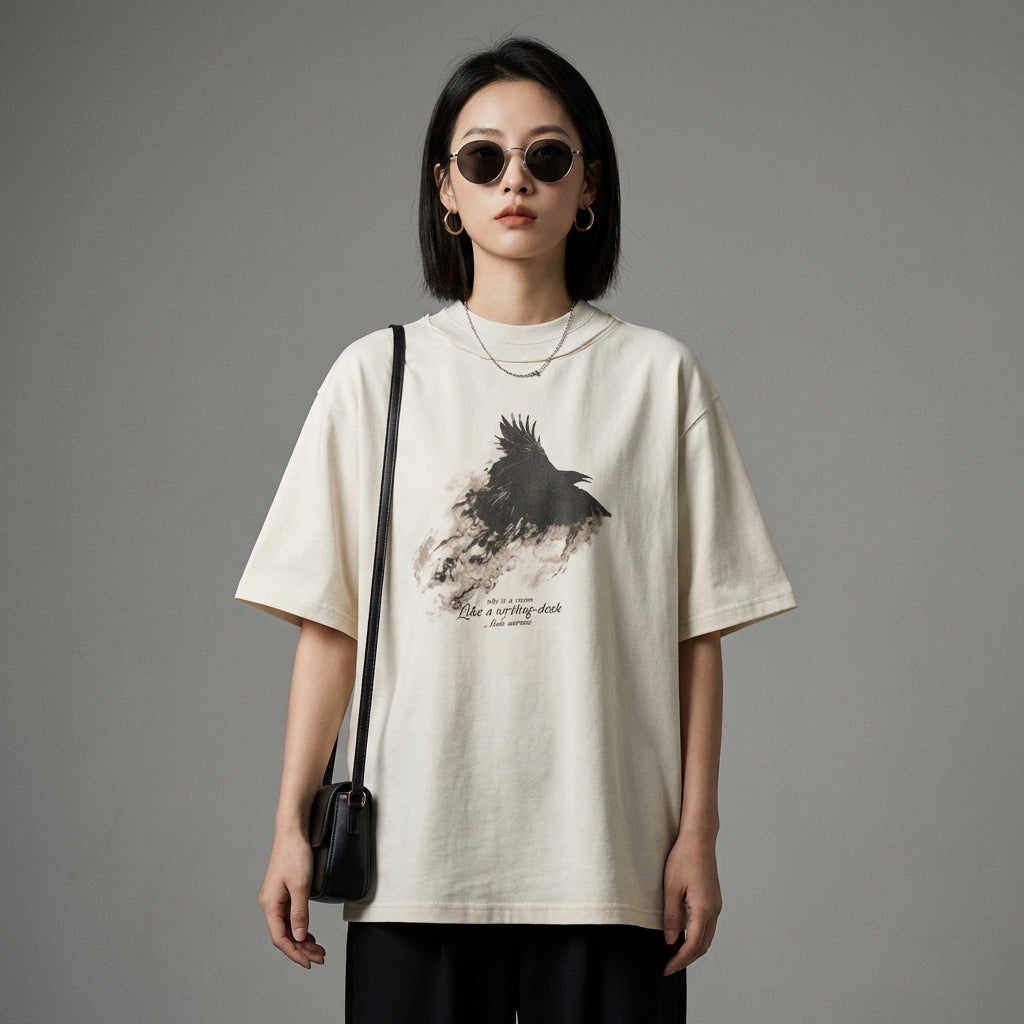 T-shirt oversize imprimé en coton pur. Style streetwear coréen décontracté pour homme et femme. Couleur noir ou apricot.