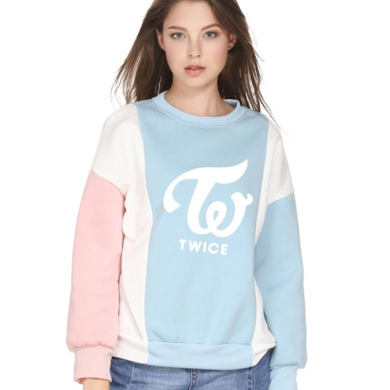 Finally be comfortable in a superb Twice sweater. This pink, blue, and white sweatshirt will be perfect if you love Vintage and Korean fashion. Discover the pleasure of walking around with a magnificent Twice logo in the middle of your chest.