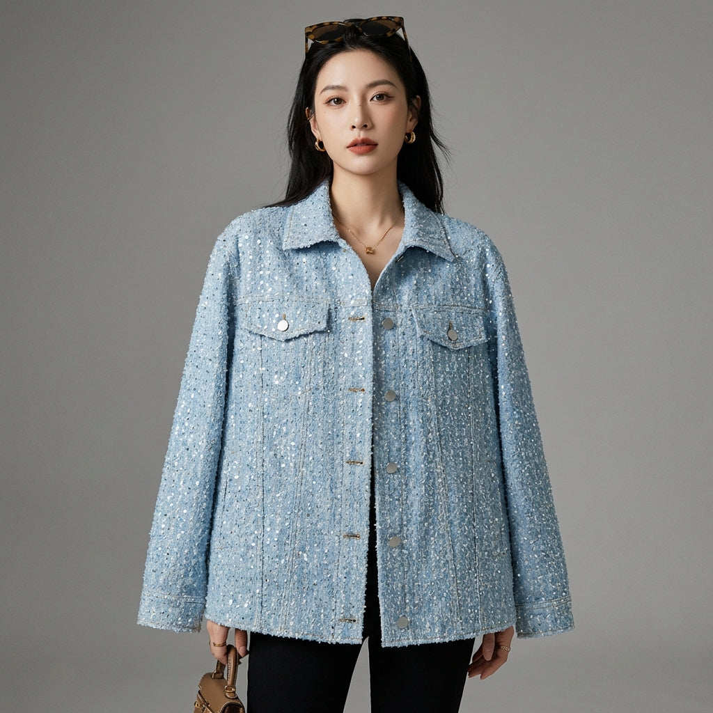 Opt for this sequined denim jacket and add a dazzling dimension to your wardrobe, while staying true to the casual elegance of Korean fashion.