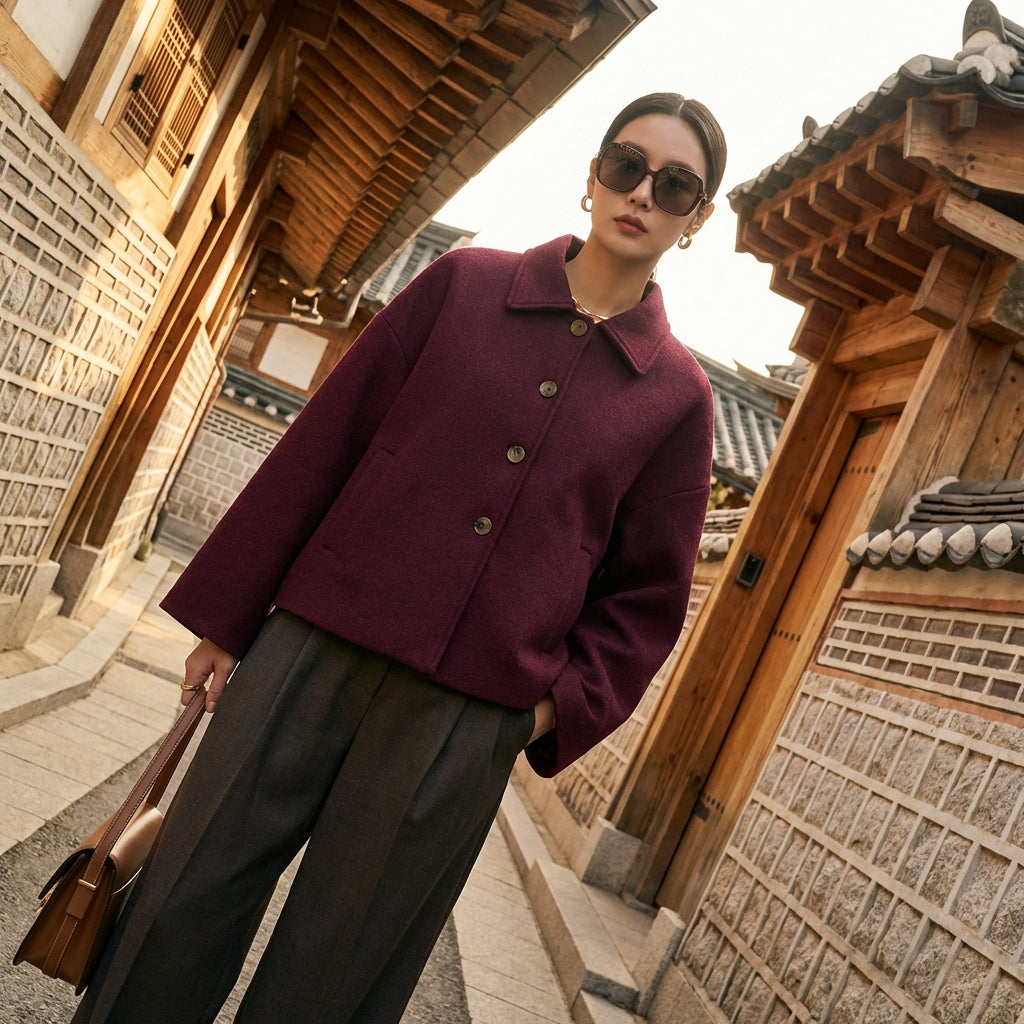 Veste courte en laine beige pour femme, col chemise, style minimaliste K-fashion. Idéale pour l&