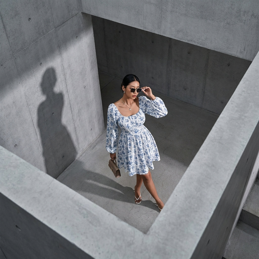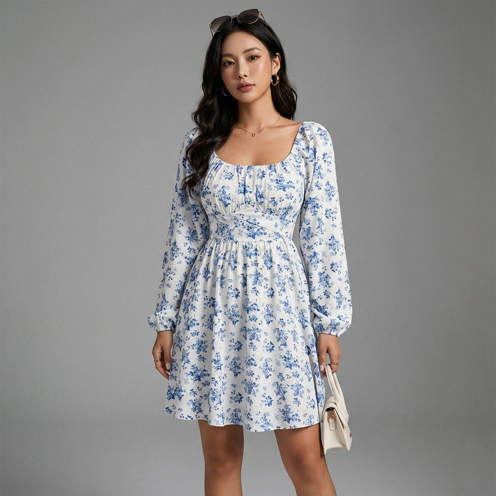 Robe courte florale blanche et bleue à col carré, manches longues. K-fashion féminine. Koreanxwear.
