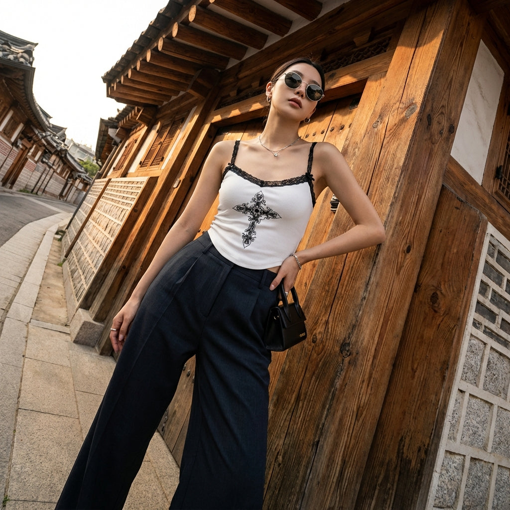 • Style: Korean Fashion, Streetwear, Minimalist, Trendy. This tank top embodies the casual elegance of K-fashion, perfect for an urban and chic style.
