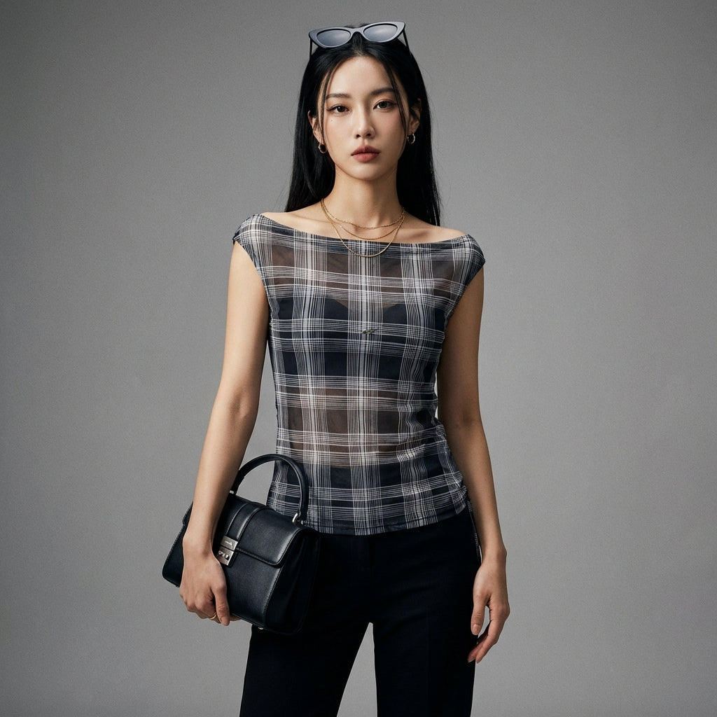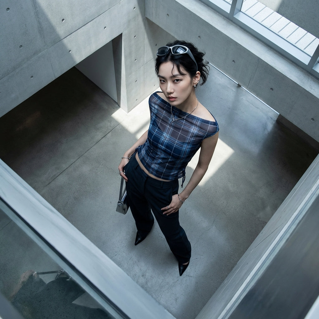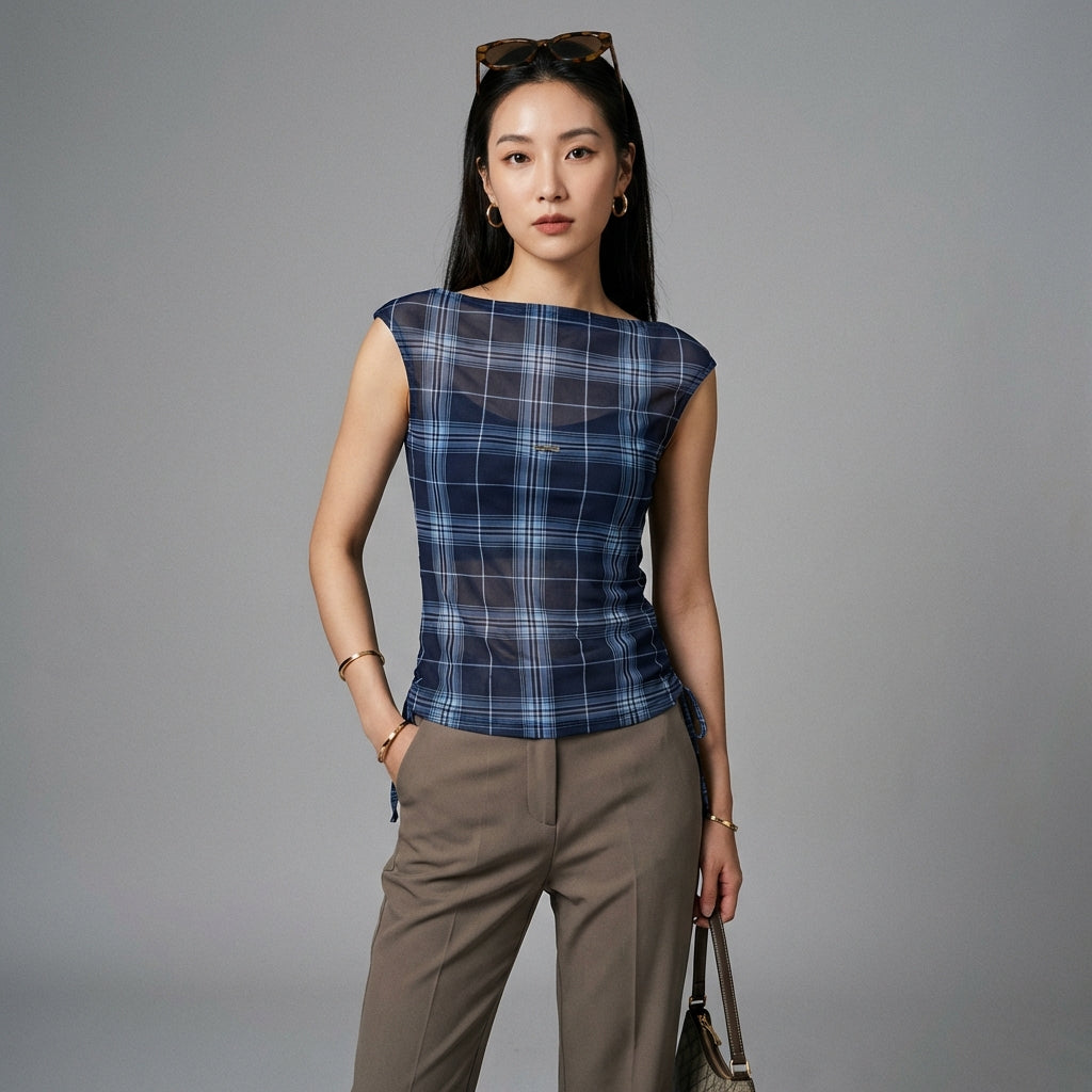 Débardeur slim à carreaux bleu et gris pour femme - Mode K-fashion Koreanxwear